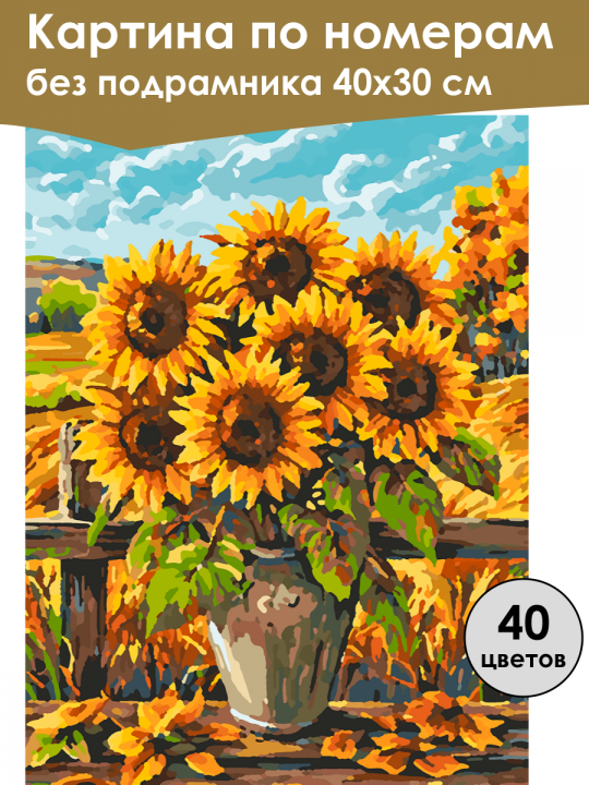 Картина по номерам без подрамника, размер 40х30 см, произведена нами. Она включает 40 оттенков и 2950 контуров, что придаёт ей глубину цвета и плавные переходы. Картина выглядит более ярко и живо. В комплект входит глянцевый лак, которым можно покрыть работу по желанию. Краски имеют хорошую укрывистость, хватает двух проходов что бы закрасить символы на схеме. Так же они сохраняют текстуру мазков, не растекаясь и не разглаживаясь полностью на холсте. При покрытии глянцевым лаком создаётся эффект приближенный к масляной живописи. Краски упакованы герметично, что сохраняет их жидкими. Все необходимые инструменты для начала работы также входят в комплект. Мы не используем экосольвентные чернила, которые содержат свинец и могут быть вредны для здоровья. Наши картины напечатаны безопасными водными пигментными чернилами, обеспечивающими чёткое изображение и легко читаемые обозначения. Холст плотный, имеет мелкую зернистость, легко разглаживается и устойчив к сминанию. Картина поставляется в бурой коробке. Следует отметить, что картина без подрамника её нельзя натянуть на подрамник из-за узких краёв, она предназначена для оформления в рамочку. Букет ярких подсолнухов в вазе на деревянном столе, расположенном на фоне живописного сельского пейзажа с голубым небом и струящимися облаками.