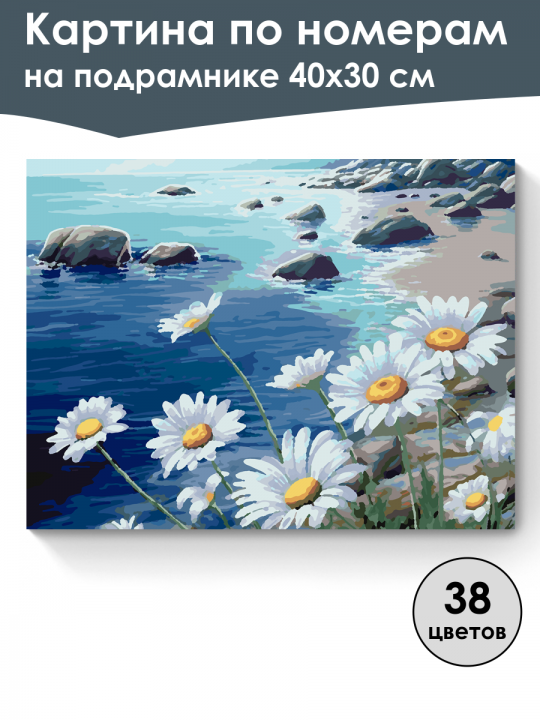 Картина по номерам на подрамнике, размер 40х30 см, произведена нами. Она включает 38 оттенков и 1666 контуров, что придаёт ей глубину цвета и плавные переходы. Картина выглядит более ярко и живо. В комплект входит глянцевый лак, которым можно покрыть работу по желанию. Краски имеют хорошую укрывистость, хватает двух проходов что бы закрасить символы на схеме. Так же они сохраняют текстуру мазков, не растекаясь и не разглаживаясь полностью на холсте. При покрытии глянцевым лаком создаётся эффект приближенный к масляной живописи. Краски упакованы герметично, что сохраняет их жидкими. Все необходимые инструменты для начала работы также включены в комплект, в том числе и крепления на стену. В картине используется крепкий подрамник со специальной вставкой, которая предотвращает провисание холста во время рисования. Это обеспечивает комфортный процесс работы и гарантирует, что холст всегда будет оставаться хорошо натянутым. Мы не используем экосольвентные чернила, которые содержат свинец и могут быть вредны для здоровья. Наши картины напечатаны безопасными водными пигментными чернилами, обеспечивающими чёткое изображение и легко читаемые обозначения. Холст плотный, имеет мелкую зернистость, легко разглаживается и устойчив к сминанию. Картина поставляется в защищённой бурой коробке. Живописный морской берег, украшенный крупными белыми ромашками на переднем плане; гладь спокойного синего моря обрамлена валунами, разбросанными вдоль берега, с плавными переходами цвета от бирюзового до темно-синего, создавая умиротворяющую атмосферу летнего дня.