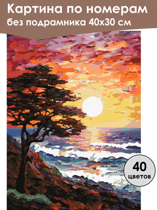 Картина по номерам без подрамника, размер 40х30 см, произведена нами. Она включает 40 оттенков и 2270 контуров, что придаёт ей глубину цвета и плавные переходы. Картина выглядит более ярко и живо. В комплект входит глянцевый лак, которым можно покрыть работу по желанию. Краски имеют хорошую укрывистость, хватает двух проходов что бы закрасить символы на схеме. Так же они сохраняют текстуру мазков, не растекаясь и не разглаживаясь полностью на холсте. При покрытии глянцевым лаком создаётся эффект приближенный к масляной живописи. Краски упакованы герметично, что сохраняет их жидкими. Все необходимые инструменты для начала работы также входят в комплект. Мы не используем экосольвентные чернила, которые содержат свинец и могут быть вредны для здоровья. Наши картины напечатаны безопасными водными пигментными чернилами, обеспечивающими чёткое изображение и легко читаемые обозначения. Холст плотный, имеет мелкую зернистость, легко разглаживается и устойчив к сминанию. Картина поставляется в бурой коробке. Следует отметить, что картина без подрамника её нельзя натянуть на подрамник из-за узких краёв, она предназначена для оформления в рамочку. Закат на берегу моря, где яркое солнце освещает небо насыщенными оттенками розового, оранжевого и жёлтого; на переднем плане выделяется силуэт дерева, а на заднем плане видна морская гладь с переливающимися волнами.