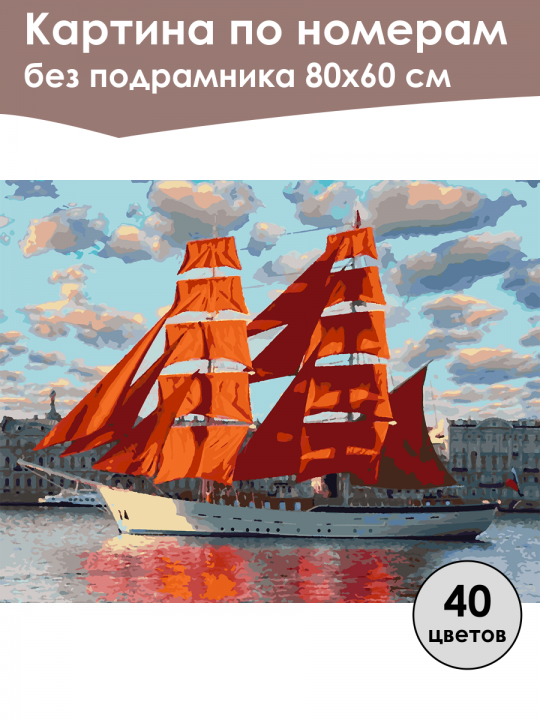 Картина по номерам без подрамника, размер 80х60 см, произведена нами. Она включает 40 оттенков и 3468 контуров, что придаёт ей глубину цвета и плавные переходы. Картина выглядит более ярко и живо. В комплект входит глянцевый лак, которым можно покрыть работу по желанию. Краски имеют хорошую укрывистость, хватает двух проходов что бы закрасить символы на схеме. Так же они сохраняют текстуру мазков, не растекаясь и не разглаживаясь полностью на холсте. При покрытии глянцевым лаком создаётся эффект приближенный к масляной живописи. Краски упакованы герметично, что сохраняет их жидкими. Все необходимые инструменты для начала работы также входят в комплект. Мы не используем экосольвентные чернила, которые содержат свинец и могут быть вредны для здоровья. Наши картины напечатаны безопасными водными пигментными чернилами, обеспечивающими чёткое изображение и легко читаемые обозначения. Холст плотный, имеет мелкую зернистость, легко разглаживается и устойчив к сминанию. Картина поставляется в защищённом буром тубусе. Следует отметить, что картина без подрамника её нельзя натянуть на подрамник из-за узких краёв, она предназначена для оформления в рамочку. На изображении показан парусник с ярко-красными алыми парусами, плавно плывущий по спокойной воде на фоне вечернего неба с живописными облаками и силуэтами Санкт-Петербурга на горизонте.