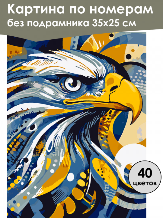 Картина по номерам без подрамника, размер 35х25 см, произведена нами. Она включает 40 оттенков и 1336 контуров, что придаёт ей глубину цвета и плавные переходы. Картина выглядит более ярко и живо. В комплект входит глянцевый лак, которым можно покрыть работу по желанию. Краски качественные, имеют хорошую укрывистость, хватает двух проходов что бы закрасить символы на схеме. Они упакованы герметично, что сохраняет их жидкими. Все необходимые инструменты для начала работы также включены в комплект. Мы не используем экосольвентные чернила, которые содержат свинец и могут быть вредны для здоровья. Наши картины напечатаны безопасными водными пигментными чернилами, обеспечивающими чёткое изображение и легко читаемые обозначения. Холст плотный, имеет мелкую зернистость, легко разглаживается и устойчив к сминанию. Картина поставляется в защищённой бурой коробке. Следует отметить, что картина без подрамника её нельзя натянуть на подрамник из-за узких краёв, она предназначена для оформления в рамочку. Голова орла, выполненная в абстрактной манере, с использованием насыщенных оттенков синего, белого, жёлтого и оранжевого цветов, создающих динамичное сочетание.
