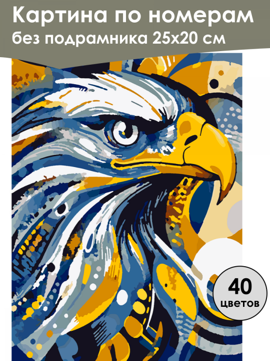 Картина по номерам без подрамника, размер 25х20 см, произведена нами. Она включает 40 оттенков и 944 контуров, что придаёт ей глубину цвета и плавные переходы. Картина выглядит более ярко и живо. В комплект входит глянцевый лак, которым можно покрыть работу по желанию. Краски качественные, имеют хорошую укрывистость, хватает двух проходов что бы закрасить символы на схеме. Они упакованы герметично, что сохраняет их жидкими. Все необходимые инструменты для начала работы также включены в комплект. Мы не используем экосольвентные чернила, которые содержат свинец и могут быть вредны для здоровья. Наши картины напечатаны безопасными водными пигментными чернилами, обеспечивающими чёткое изображение и легко читаемые обозначения. Холст плотный, имеет мелкую зернистость, легко разглаживается и устойчив к сминанию. Картина поставляется в бурой коробке. Следует отметить, что картина без подрамника её нельзя натянуть на подрамник из-за узких краёв, она предназначена для оформления в рамочку. Голова орла, выполненная в абстрактной манере, с использованием насыщенных оттенков синего, белого, жёлтого и оранжевого цветов, создающих динамичное сочетание.