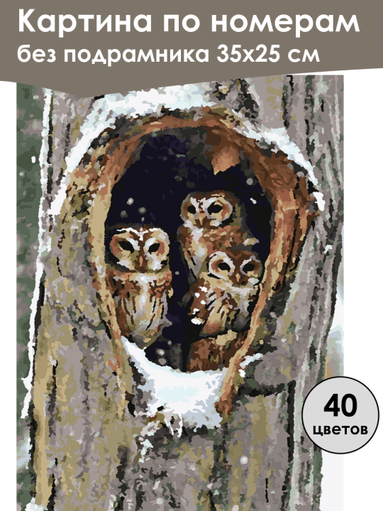 Картина по номерам без подрамника, размер 35х25 см, произведена нами. Она включает 40 оттенков и 3028 контуров, что придаёт ей глубину цвета и плавные переходы. Картина выглядит более ярко и живо. В комплект входит глянцевый лак, которым можно покрыть работу по желанию. Краски качественные, имеют хорошую укрывистость, хватает двух проходов что бы закрасить символы на схеме. Они упакованы герметично, что сохраняет их жидкими. Все необходимые инструменты для начала работы также включены в комплект. Мы не используем экосольвентные чернила, которые содержат свинец и могут быть вредны для здоровья. Наши картины напечатаны безопасными водными пигментными чернилами, обеспечивающими чёткое изображение и легко читаемые обозначения. Холст плотный, имеет мелкую зернистость, легко разглаживается и устойчив к сминанию. Картина поставляется в защищённой бурой коробке. Следует отметить, что картина без подрамника её нельзя натянуть на подрамник из-за узких краёв, она предназначена для оформления в рамочку. Три совы уютно устроились в дупле дерева, покрытого снегом, их крупные выразительные глаза пристально смотрят наружу, оттенки древесной коры и белого снега создают живописную и умиротворяющую зимнюю сцену.