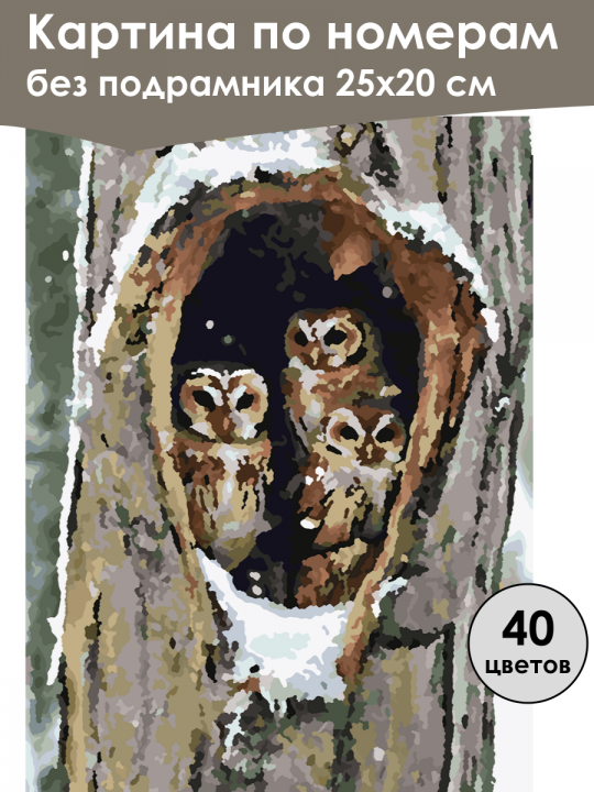 Картина по номерам без подрамника, размер 25х20 см, произведена нами. Она включает 40 оттенков и 1726 контуров, что придаёт ей глубину цвета и плавные переходы. Картина выглядит более ярко и живо. В комплект входит глянцевый лак, которым можно покрыть работу по желанию. Краски качественные, имеют хорошую укрывистость, хватает двух проходов что бы закрасить символы на схеме. Они упакованы герметично, что сохраняет их жидкими. Все необходимые инструменты для начала работы также включены в комплект. Мы не используем экосольвентные чернила, которые содержат свинец и могут быть вредны для здоровья. Наши картины напечатаны безопасными водными пигментными чернилами, обеспечивающими чёткое изображение и легко читаемые обозначения. Холст плотный, имеет мелкую зернистость, легко разглаживается и устойчив к сминанию. Картина поставляется в бурой коробке. Следует отметить, что картина без подрамника её нельзя натянуть на подрамник из-за узких краёв, она предназначена для оформления в рамочку. Три совы уютно устроились в дупле дерева, покрытого снегом, их крупные выразительные глаза пристально смотрят наружу, оттенки древесной коры и белого снега создают живописную и умиротворяющую зимнюю сцену.