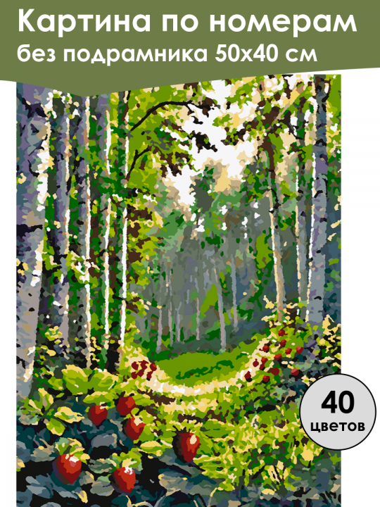 Картина по номерам без подрамника, размер 50х40 см, произведена нами. Она включает 40 оттенков и 4448 контуров, что придаёт ей глубину цвета и плавные переходы. Картина выглядит более ярко и живо. В комплект входит глянцевый лак, которым можно покрыть работу по желанию. Краски имеют хорошую укрывистость, хватает двух проходов что бы закрасить символы на схеме. Так же они сохраняют текстуру мазков, не растекаясь и не разглаживаясь полностью на холсте. При покрытии глянцевым лаком создаётся эффект приближенный к масляной живописи. Краски упакованы герметично, что сохраняет их жидкими. Все необходимые инструменты для начала работы также входят в комплект. Мы не используем экосольвентные чернила, которые содержат свинец и могут быть вредны для здоровья. Наши картины напечатаны безопасными водными пигментными чернилами, обеспечивающими чёткое изображение и легко читаемые обозначения. Холст плотный, имеет мелкую зернистость, легко разглаживается и устойчив к сминанию. Картина поставляется в бурой коробке. Следует отметить, что картина без подрамника её нельзя натянуть на подрамник из-за узких краёв, она предназначена для оформления в рамочку. Живописная сцена леса, окружённого берёзами с яркими зелёными листьями и солнечным светом, пробивающимся сквозь листву; на переднем плане видны кусты с красными ягодами в изобилии, добавляющие яркие акценты к зелёной палитре природы.