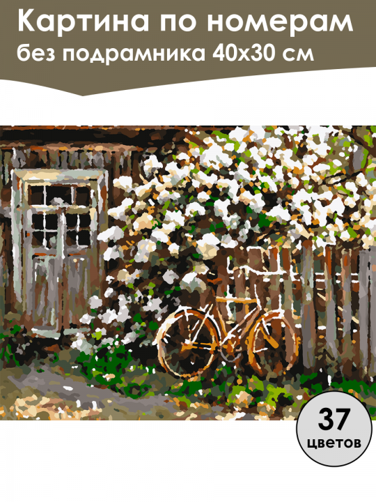 Картина по номерам без подрамника, размер 40х30 см, произведена нами. Она включает 37 оттенков и 3708 контуров, что придаёт ей глубину цвета и плавные переходы. Картина выглядит более ярко и живо. В комплект входит глянцевый лак, которым можно покрыть работу по желанию. Краски имеют хорошую укрывистость, хватает двух проходов что бы закрасить символы на схеме. Так же они сохраняют текстуру мазков, не растекаясь и не разглаживаясь полностью на холсте. При покрытии глянцевым лаком создаётся эффект приближенный к масляной живописи. Краски упакованы герметично, что сохраняет их жидкими. Все необходимые инструменты для начала работы также входят в комплект. Мы не используем экосольвентные чернила, которые содержат свинец и могут быть вредны для здоровья. Наши картины напечатаны безопасными водными пигментными чернилами, обеспечивающими чёткое изображение и легко читаемые обозначения. Холст плотный, имеет мелкую зернистость, легко разглаживается и устойчив к сминанию. Картина поставляется в бурой коробке. Следует отметить, что картина без подрамника её нельзя натянуть на подрамник из-за узких краёв, она предназначена для оформления в рамочку. Дом с садом: старая деревянная дверь в ретро-стиле с многократно крашеным покрытием находится слева, рядом с ней раскидистый куст с обильными белыми цветами, подчеркивающими летнее настроение; справа у старого деревянного забора прислонён винтажный велосипед, вокруг которого буйно растет зелёная трава и ветви цветущего растения.