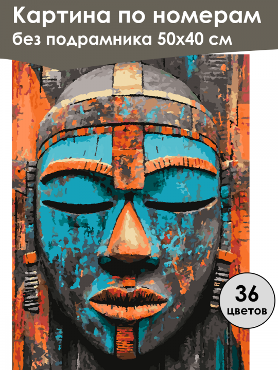 Картина по номерам без подрамника, размер 50х40 см, произведена нами. Она включает 36 оттенков и 3247 контуров, что придаёт ей глубину цвета и плавные переходы. Картина выглядит более ярко и живо. В комплект входит глянцевый лак, которым можно покрыть работу по желанию. Краски имеют хорошую укрывистость, хватает двух проходов что бы закрасить символы на схеме. Так же они сохраняют текстуру мазков, не растекаясь и не разглаживаясь полностью на холсте. При покрытии глянцевым лаком создаётся эффект приближенный к масляной живописи. Краски упакованы герметично, что сохраняет их жидкими. Все необходимые инструменты для начала работы также входят в комплект. Мы не используем экосольвентные чернила, которые содержат свинец и могут быть вредны для здоровья. Наши картины напечатаны безопасными водными пигментными чернилами, обеспечивающими чёткое изображение и легко читаемые обозначения. Холст плотный, имеет мелкую зернистость, легко разглаживается и устойчив к сминанию. Картина поставляется в бурой коробке. Следует отметить, что картина без подрамника её нельзя натянуть на подрамник из-за узких краёв, она предназначена для оформления в рамочку. Абстрактная маска с африканскими мотивами, выполненная в ярких тонах — оранжевом, голубом и коричневом; она декорирована геометрическими узорами и акцентами, что придают изделию выразительность и динамичность, создавая впечатление древнего артефакта с современным художественным подходом.