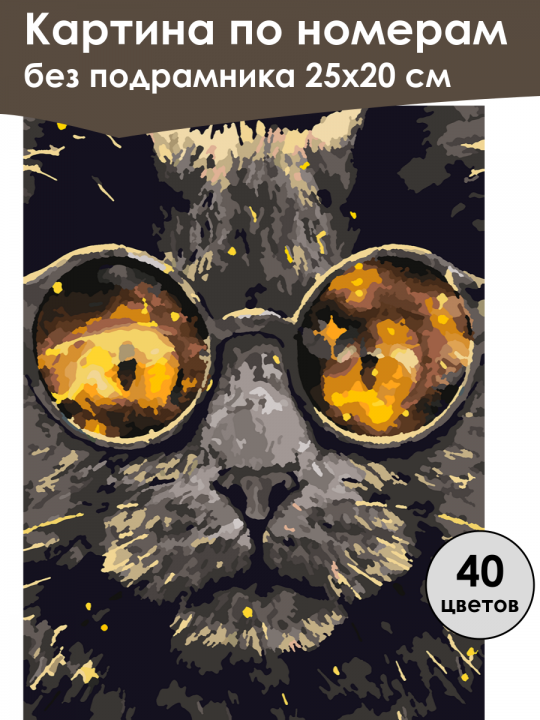 Картина по номерам без подрамника, размер 25х20 см, произведена нами. Она включает 40 оттенков и 1023 контуров, что придаёт ей глубину цвета и плавные переходы. Картина выглядит более ярко и живо. В комплект входит глянцевый лак, которым можно покрыть работу по желанию. Краски качественные, имеют хорошую укрывистость, хватает двух проходов что бы закрасить символы на схеме. Они упакованы герметично, что сохраняет их жидкими. Все необходимые инструменты для начала работы также включены в комплект. Мы не используем экосольвентные чернила, которые содержат свинец и могут быть вредны для здоровья. Наши картины напечатаны безопасными водными пигментными чернилами, обеспечивающими чёткое изображение и легко читаемые обозначения. Холст плотный, имеет мелкую зернистость, легко разглаживается и устойчив к сминанию. Картина поставляется в бурой коробке. Следует отметить, что картина без подрамника её нельзя натянуть на подрамник из-за узких краёв, она предназначена для оформления в рамочку. Стилизованное изображение морды кота в крупных круглых очках в ретро-стиле, линзы очков переливаются яркими оранжевыми и желтоватыми оттенками, создающими эффект звездного неба, мех кота изображён в оттенках серого с резкими контрастными штрихами, что добавляет рисунку выразительности и художественной глубины.