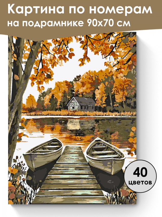 Картина по номерам на подрамнике, размер 90х70 см, произведена нами. Она включает 40 оттенков и 6819 контуров, что придаёт ей глубину цвета и плавные переходы. Картина выглядит более ярко и живо. В комплект входит глянцевый лак, которым можно покрыть работу по желанию. Краски имеют хорошую укрывистость, хватает двух проходов что бы закрасить символы на схеме. Так же они сохраняют текстуру мазков, не растекаясь и не разглаживаясь полностью на холсте. При покрытии глянцевым лаком создаётся эффект приближенный к масляной живописи. Краски упакованы герметично, что сохраняет их жидкими. Все необходимые инструменты для начала работы также включены в комплект, в том числе и крепления на стену. В картине используется крепкий подрамник со специальной вставкой, которая предотвращает провисание холста во время рисования. Это обеспечивает комфортный процесс работы и гарантирует, что холст всегда будет оставаться хорошо натянутым. Мы не используем экосольвентные чернила, которые содержат свинец и могут быть вредны для здоровья. Наши картины напечатаны безопасными водными пигментными чернилами, обеспечивающими чёткое изображение и легко читаемые обозначения. Холст плотный, имеет мелкую зернистость, легко разглаживается и устойчив к сминанию. Картина поставляется в защищённой бурой коробке. Живописный осенний пейзаж с двумя лодками у деревянного причала на фоне спокойного озера; деревья с оранжево-жёлтой листвой обрамляют сцену, а вдалеке среди леса виднеется домик, отражающийся в воде.