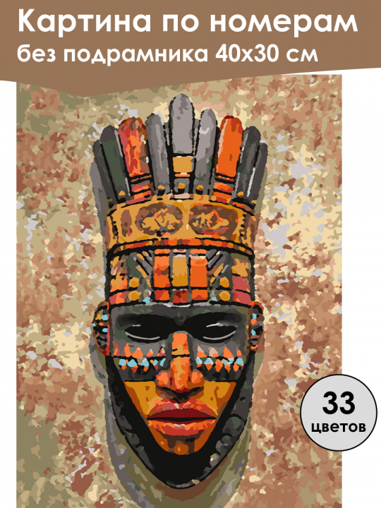 Картина по номерам без подрамника, размер 40х30 см, произведена нами. Она включает 33 оттенков и 2910 контуров, что придаёт ей глубину цвета и плавные переходы. Картина выглядит более ярко и живо. В комплект входит глянцевый лак, которым можно покрыть работу по желанию. Краски имеют хорошую укрывистость, хватает двух проходов что бы закрасить символы на схеме. Так же они сохраняют текстуру мазков, не растекаясь и не разглаживаясь полностью на холсте. При покрытии глянцевым лаком создаётся эффект приближенный к масляной живописи. Краски упакованы герметично, что сохраняет их жидкими. Все необходимые инструменты для начала работы также входят в комплект. Мы не используем экосольвентные чернила, которые содержат свинец и могут быть вредны для здоровья. Наши картины напечатаны безопасными водными пигментными чернилами, обеспечивающими чёткое изображение и легко читаемые обозначения. Холст плотный, имеет мелкую зернистость, легко разглаживается и устойчив к сминанию. Картина поставляется в бурой коробке. Следует отметить, что картина без подрамника её нельзя натянуть на подрамник из-за узких краёв, она предназначена для оформления в рамочку. Яркая декоративная маска, выполненная в насыщенных оранжевых, красных и черных тонах с геометрическими узорами и орнаментами, окруженная узким обрамлением в верхней части, с массивными элементами, напоминающими пера, на фоне в легкой текстуре теплых оттенков.