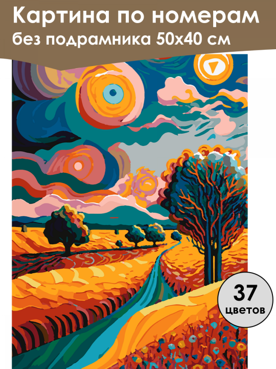 Картина по номерам без подрамника, размер 50х40 см, произведена нами. Она включает 37 оттенков и 1775 контуров, что придаёт ей глубину цвета и плавные переходы. Картина выглядит более ярко и живо. В комплект входит глянцевый лак, которым можно покрыть работу по желанию. Краски имеют хорошую укрывистость, хватает двух проходов что бы закрасить символы на схеме. Так же они сохраняют текстуру мазков, не растекаясь и не разглаживаясь полностью на холсте. При покрытии глянцевым лаком создаётся эффект приближенный к масляной живописи. Краски упакованы герметично, что сохраняет их жидкими. Все необходимые инструменты для начала работы также входят в комплект. Мы не используем экосольвентные чернила, которые содержат свинец и могут быть вредны для здоровья. Наши картины напечатаны безопасными водными пигментными чернилами, обеспечивающими чёткое изображение и легко читаемые обозначения. Холст плотный, имеет мелкую зернистость, легко разглаживается и устойчив к сминанию. Картина поставляется в бурой коробке. Следует отметить, что картина без подрамника её нельзя натянуть на подрамник из-за узких краёв, она предназначена для оформления в рамочку. Яркий и динамичный пейзаж выполнен в стиле постимпрессионизма, с насыщенными цветами и абстрактными формами; дорога ведет сквозь золотые поля, обрамленные деревьями, а небо заполнено swirling узорами и сияющими солнечными дисками, создающими ощущение движения и энергии, подчеркивающее красоту природы.