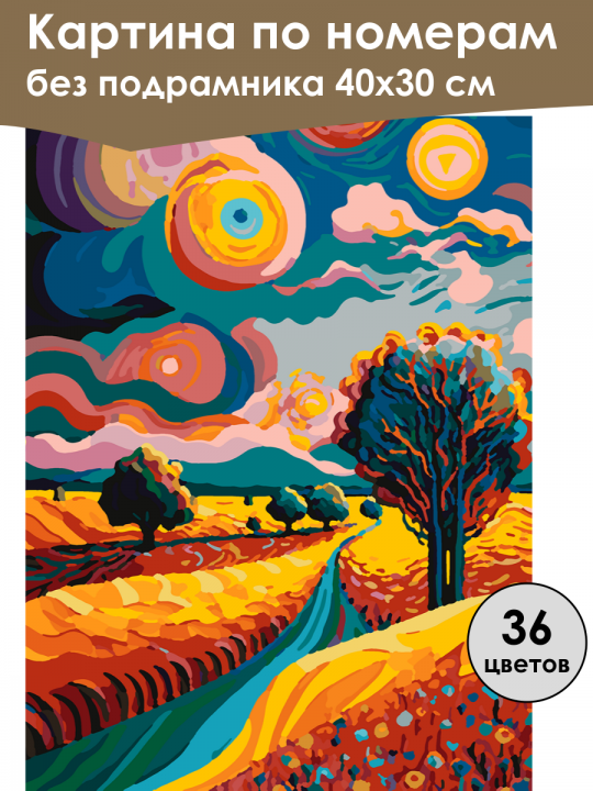 Картина по номерам без подрамника, размер 40х30 см, произведена нами. Она включает 36 оттенков и 1423 контуров, что придаёт ей глубину цвета и плавные переходы. Картина выглядит более ярко и живо. В комплект входит глянцевый лак, которым можно покрыть работу по желанию. Краски имеют хорошую укрывистость, хватает двух проходов что бы закрасить символы на схеме. Так же они сохраняют текстуру мазков, не растекаясь и не разглаживаясь полностью на холсте. При покрытии глянцевым лаком создаётся эффект приближенный к масляной живописи. Краски упакованы герметично, что сохраняет их жидкими. Все необходимые инструменты для начала работы также входят в комплект. Мы не используем экосольвентные чернила, которые содержат свинец и могут быть вредны для здоровья. Наши картины напечатаны безопасными водными пигментными чернилами, обеспечивающими чёткое изображение и легко читаемые обозначения. Холст плотный, имеет мелкую зернистость, легко разглаживается и устойчив к сминанию. Картина поставляется в бурой коробке. Следует отметить, что картина без подрамника её нельзя натянуть на подрамник из-за узких краёв, она предназначена для оформления в рамочку. Яркий и динамичный пейзаж выполнен в стиле постимпрессионизма, с насыщенными цветами и абстрактными формами; дорога ведет сквозь золотые поля, обрамленные деревьями, а небо заполнено swirling узорами и сияющими солнечными дисками, создающими ощущение движения и энергии, подчеркивающее красоту природы.