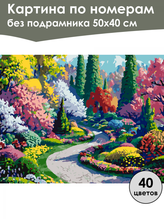 Картина по номерам без подрамника, размер 50х40 см, произведена нами. Она включает 40 оттенков и 3148 контуров, что придаёт ей глубину цвета и плавные переходы. Картина выглядит более ярко и живо. В комплект входит глянцевый лак, которым можно покрыть работу по желанию. Краски имеют хорошую укрывистость, хватает двух проходов что бы закрасить символы на схеме. Так же они сохраняют текстуру мазков, не растекаясь и не разглаживаясь полностью на холсте. При покрытии глянцевым лаком создаётся эффект приближенный к масляной живописи. Краски упакованы герметично, что сохраняет их жидкими. Все необходимые инструменты для начала работы также входят в комплект. Мы не используем экосольвентные чернила, которые содержат свинец и могут быть вредны для здоровья. Наши картины напечатаны безопасными водными пигментными чернилами, обеспечивающими чёткое изображение и легко читаемые обозначения. Холст плотный, имеет мелкую зернистость, легко разглаживается и устойчив к сминанию. Картина поставляется в бурой коробке. Следует отметить, что картина без подрамника её нельзя натянуть на подрамник из-за узких краёв, она предназначена для оформления в рамочку. Красивый пейзаж с извилистой тропинкой, окружённой разнообразными пышными кустами и деревьями в ярких цветах: розовом, жёлтом, зелёном и сиреневом; на заднем плане видны силуэты гор, а небо голубое с лёгкими облаками.