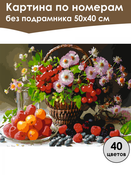 Картина по номерам без подрамника, размер 50х40 см, произведена нами. Она включает 40 оттенков и 2527 контуров, что придаёт ей глубину цвета и плавные переходы. Картина выглядит более ярко и живо. В комплект входит глянцевый лак, которым можно покрыть работу по желанию. Краски имеют хорошую укрывистость, хватает двух проходов что бы закрасить символы на схеме. Так же они сохраняют текстуру мазков, не растекаясь и не разглаживаясь полностью на холсте. При покрытии глянцевым лаком создаётся эффект приближенный к масляной живописи. Краски упакованы герметично, что сохраняет их жидкими. Все необходимые инструменты для начала работы также входят в комплект. Мы не используем экосольвентные чернила, которые содержат свинец и могут быть вредны для здоровья. Наши картины напечатаны безопасными водными пигментными чернилами, обеспечивающими чёткое изображение и легко читаемые обозначения. Холст плотный, имеет мелкую зернистость, легко разглаживается и устойчив к сминанию. Картина поставляется в бурой коробке. Следует отметить, что картина без подрамника её нельзя натянуть на подрамник из-за узких краёв, она предназначена для оформления в рамочку. Натюрморт с плетёной корзиной, украшенной цветами с белыми и розовыми лепестками, вокруг которой находятся яркие красные ягоды; на переднем плане лежат красные и оранжевые фрукты, виноград и малина, создавая атмосферу богатства и изобилия природы.