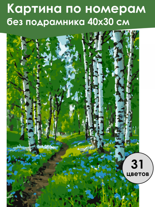 Картина по номерам без подрамника, размер 40х30 см, произведена нами. Она включает 31 оттенков и 3274 контуров, что придаёт ей глубину цвета и плавные переходы. Картина выглядит более ярко и живо. В комплект входит глянцевый лак, которым можно покрыть работу по желанию. Краски имеют хорошую укрывистость, хватает двух проходов что бы закрасить символы на схеме. Так же они сохраняют текстуру мазков, не растекаясь и не разглаживаясь полностью на холсте. При покрытии глянцевым лаком создаётся эффект приближенный к масляной живописи. Краски упакованы герметично, что сохраняет их жидкими. Все необходимые инструменты для начала работы также входят в комплект. Мы не используем экосольвентные чернила, которые содержат свинец и могут быть вредны для здоровья. Наши картины напечатаны безопасными водными пигментными чернилами, обеспечивающими чёткое изображение и легко читаемые обозначения. Холст плотный, имеет мелкую зернистость, легко разглаживается и устойчив к сминанию. Картина поставляется в бурой коробке. Следует отметить, что картина без подрамника её нельзя натянуть на подрамник из-за узких краёв, она предназначена для оформления в рамочку. Лиственный берёзовый лес, освещённый мягким солнечным светом; высокие стройные стволы берёз чередуются с пушистыми кронами деревьев, а между ними пролегает узкая тропинка, ведущая вглубь леса, подчёркивающая чувство глубины и уюта, вокруг которой ярким пятном рассыпаны цветущие синие цветы, создавая атмосферу весеннего пробуждения природы.