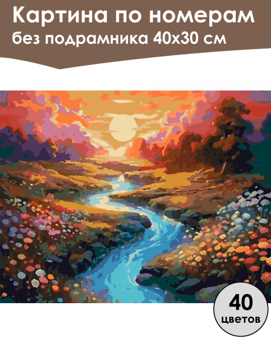 Картина по номерам без подрамника, размер 40х30 см, произведена нами. Она включает 40 оттенков и 2060 контуров, что придаёт ей глубину цвета и плавные переходы. Картина выглядит более ярко и живо. В комплект входит глянцевый лак, которым можно покрыть работу по желанию. Краски имеют хорошую укрывистость, хватает двух проходов что бы закрасить символы на схеме. Так же они сохраняют текстуру мазков, не растекаясь и не разглаживаясь полностью на холсте. При покрытии глянцевым лаком создаётся эффект приближенный к масляной живописи. Краски упакованы герметично, что сохраняет их жидкими. Все необходимые инструменты для начала работы также входят в комплект. Мы не используем экосольвентные чернила, которые содержат свинец и могут быть вредны для здоровья. Наши картины напечатаны безопасными водными пигментными чернилами, обеспечивающими чёткое изображение и легко читаемые обозначения. Холст плотный, имеет мелкую зернистость, легко разглаживается и устойчив к сминанию. Картина поставляется в бурой коробке. Следует отметить, что картина без подрамника её нельзя натянуть на подрамник из-за узких краёв, она предназначена для оформления в рамочку. Яркий пейзаж с извилистой речкой, текущей через поле, усеянное разноцветными цветами, на фоне закатного неба с богатыми оттенками оранжевого, розового и фиолетового, создающего теплую и живописную атмосферу.