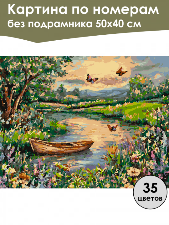 Картина по номерам без подрамника, размер 50х40 см, произведена нами. Она включает 35 оттенков и 4856 контуров, что придаёт ей глубину цвета и плавные переходы. Картина выглядит более ярко и живо. В комплект входит глянцевый лак, которым можно покрыть работу по желанию. Краски имеют хорошую укрывистость, хватает двух проходов что бы закрасить символы на схеме. Так же они сохраняют текстуру мазков, не растекаясь и не разглаживаясь полностью на холсте. При покрытии глянцевым лаком создаётся эффект приближенный к масляной живописи. Краски упакованы герметично, что сохраняет их жидкими. Все необходимые инструменты для начала работы также входят в комплект. Мы не используем экосольвентные чернила, которые содержат свинец и могут быть вредны для здоровья. Наши картины напечатаны безопасными водными пигментными чернилами, обеспечивающими чёткое изображение и легко читаемые обозначения. Холст плотный, имеет мелкую зернистость, легко разглаживается и устойчив к сминанию. Картина поставляется в бурой коробке. Следует отметить, что картина без подрамника её нельзя натянуть на подрамник из-за узких краёв, она предназначена для оформления в рамочку. Живописный пейзаж в стиле импрессионизма: река с деревянной лодкой на фоне цветущих полей и деревьев, небо окрашено мягкими оттенками заката, а над водой кружат бабочки, создавая атмосферу спокойствия и гармонии природы.