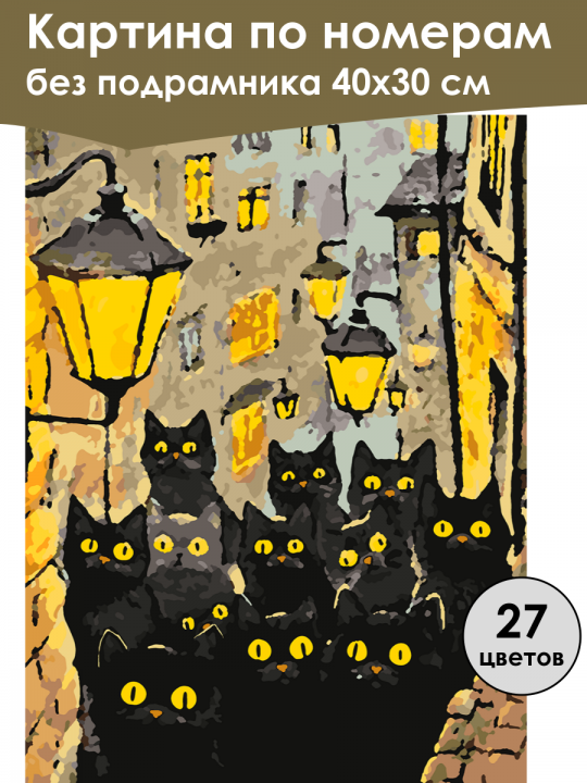 Картина по номерам без подрамника, размер 40х30 см, произведена нами. Она включает 27 оттенков и 1672 контуров, что придаёт ей глубину цвета и плавные переходы. Картина выглядит более ярко и живо. В комплект входит глянцевый лак, которым можно покрыть работу по желанию. Краски имеют хорошую укрывистость, хватает двух проходов что бы закрасить символы на схеме. Так же они сохраняют текстуру мазков, не растекаясь и не разглаживаясь полностью на холсте. При покрытии глянцевым лаком создаётся эффект приближенный к масляной живописи. Краски упакованы герметично, что сохраняет их жидкими. Все необходимые инструменты для начала работы также входят в комплект. Мы не используем экосольвентные чернила, которые содержат свинец и могут быть вредны для здоровья. Наши картины напечатаны безопасными водными пигментными чернилами, обеспечивающими чёткое изображение и легко читаемые обозначения. Холст плотный, имеет мелкую зернистость, легко разглаживается и устойчив к сминанию. Картина поставляется в бурой коробке. Следует отметить, что картина без подрамника её нельзя натянуть на подрамник из-за узких краёв, она предназначена для оформления в рамочку. Много черных кошек с ярко-желтыми глазами, смотрящих вперед, на фоне старинной городской улочки, освещенной теплыми желтыми уличными фонарями.