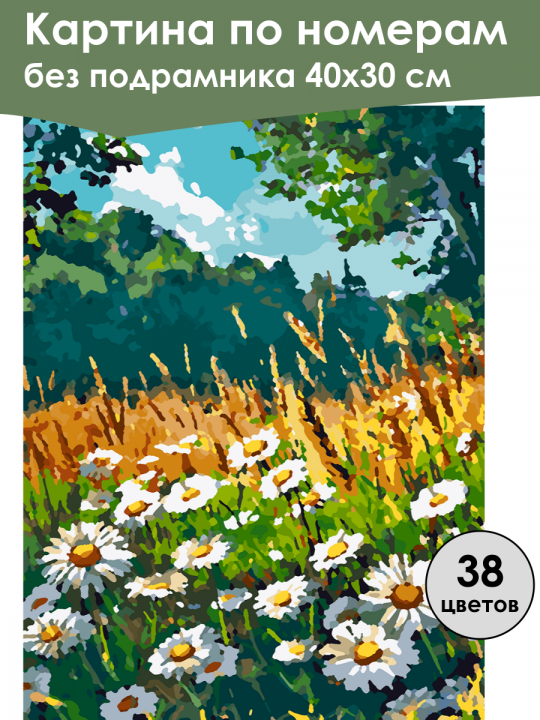 Картина по номерам без подрамника, размер 40х30 см, произведена нами. Она включает 38 оттенков и 2808 контуров, что придаёт ей глубину цвета и плавные переходы. Картина выглядит более ярко и живо. В комплект входит глянцевый лак, которым можно покрыть работу по желанию. Краски имеют хорошую укрывистость, хватает двух проходов что бы закрасить символы на схеме. Так же они сохраняют текстуру мазков, не растекаясь и не разглаживаясь полностью на холсте. При покрытии глянцевым лаком создаётся эффект приближенный к масляной живописи. Краски упакованы герметично, что сохраняет их жидкими. Все необходимые инструменты для начала работы также входят в комплект. Мы не используем экосольвентные чернила, которые содержат свинец и могут быть вредны для здоровья. Наши картины напечатаны безопасными водными пигментными чернилами, обеспечивающими чёткое изображение и легко читаемые обозначения. Холст плотный, имеет мелкую зернистость, легко разглаживается и устойчив к сминанию. Картина поставляется в бурой коробке. Следует отметить, что картина без подрамника её нельзя натянуть на подрамник из-за узких краёв, она предназначена для оформления в рамочку. Пейзаж с цветущими ромашками на переднем плане, окруженными зелёной травой и жёлтыми колосками, на фоне виднеется линия леса с густыми зелёными кронами деревьев, а в небе рассеяны снежно-белые облака.