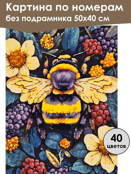 Картина по номерам без подрамника, размер 50х40 см, произведена нами. Она включает 40 оттенков и 3730 контуров, что придаёт ей глубину цвета и плавные переходы. Картина выглядит более ярко и живо. В комплект входит глянцевый лак, которым можно покрыть работу по желанию. Краски имеют хорошую укрывистость, хватает двух проходов что бы закрасить символы на схеме. Так же они сохраняют текстуру мазков, не растекаясь и не разглаживаясь полностью на холсте. При покрытии глянцевым лаком создаётся эффект приближенный к масляной живописи. Краски упакованы герметично, что сохраняет их жидкими. Все необходимые инструменты для начала работы также входят в комплект. Мы не используем экосольвентные чернила, которые содержат свинец и могут быть вредны для здоровья. Наши картины напечатаны безопасными водными пигментными чернилами, обеспечивающими чёткое изображение и легко читаемые обозначения. Холст плотный, имеет мелкую зернистость, легко разглаживается и устойчив к сминанию. Картина поставляется в бурой коробке. Следует отметить, что картина без подрамника её нельзя натянуть на подрамник из-за узких краёв, она предназначена для оформления в рамочку. Крупная пчела с яркими жёлтыми и чёрными полосами расположена в центре композиции, окружённая цветами и ягодами; жёлтые, белые цветы и красные, фиолетовые ягоды создают насыщенный, красочный фон, подчёркивая детализацию и текстуру крыльев и тела насекомого.