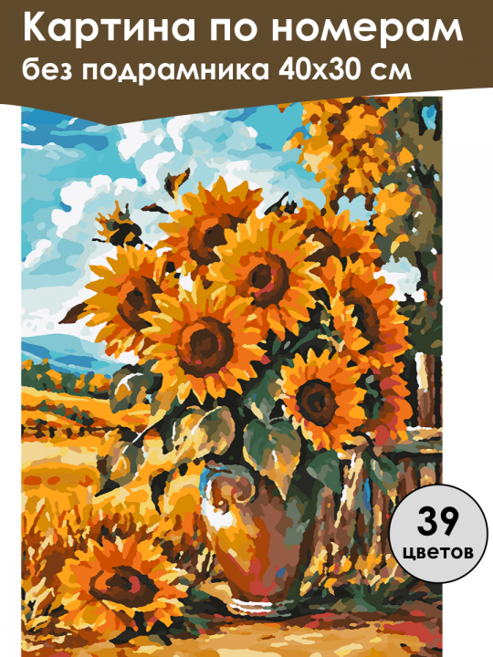 Картина по номерам без подрамника, размер 40х30 см, произведена нами. Она включает 39 оттенков и 2799 контуров, что придаёт ей глубину цвета и плавные переходы. Картина выглядит более ярко и живо. В комплект входит глянцевый лак, которым можно покрыть работу по желанию. Краски имеют хорошую укрывистость, хватает двух проходов что бы закрасить символы на схеме. Так же они сохраняют текстуру мазков, не растекаясь и не разглаживаясь полностью на холсте. При покрытии глянцевым лаком создаётся эффект приближенный к масляной живописи. Краски упакованы герметично, что сохраняет их жидкими. Все необходимые инструменты для начала работы также входят в комплект. Мы не используем экосольвентные чернила, которые содержат свинец и могут быть вредны для здоровья. Наши картины напечатаны безопасными водными пигментными чернилами, обеспечивающими чёткое изображение и легко читаемые обозначения. Холст плотный, имеет мелкую зернистость, легко разглаживается и устойчив к сминанию. Картина поставляется в бурой коробке. Следует отметить, что картина без подрамника её нельзя натянуть на подрамник из-за узких краёв, она предназначена для оформления в рамочку. Яркая и красочная сцена с букетом крупных подсолнухов в керамической вазе, стоящей на фоне пейзажа с золотыми полями и голубым небом с облаками, создающая атмосферу летнего солнечного дня.