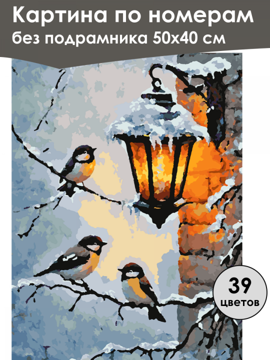Картина по номерам без подрамника, размер 50х40 см, произведена нами. Она включает 39 оттенков и 1913 контуров, что придаёт ей глубину цвета и плавные переходы. Картина выглядит более ярко и живо. В комплект входит глянцевый лак, которым можно покрыть работу по желанию. Краски имеют хорошую укрывистость, хватает двух проходов что бы закрасить символы на схеме. Так же они сохраняют текстуру мазков, не растекаясь и не разглаживаясь полностью на холсте. При покрытии глянцевым лаком создаётся эффект приближенный к масляной живописи. Краски упакованы герметично, что сохраняет их жидкими. Все необходимые инструменты для начала работы также входят в комплект. Мы не используем экосольвентные чернила, которые содержат свинец и могут быть вредны для здоровья. Наши картины напечатаны безопасными водными пигментными чернилами, обеспечивающими чёткое изображение и легко читаемые обозначения. Холст плотный, имеет мелкую зернистость, легко разглаживается и устойчив к сминанию. Картина поставляется в бурой коробке. Следует отметить, что картина без подрамника её нельзя натянуть на подрамник из-за узких краёв, она предназначена для оформления в рамочку. Три птицы на заснеженных ветках рядом с фонарём, излучающим тёплый свет, окружающий фон выполнен в холодных голубоватых тонах, создавая контраст и атмосферу зимнего вечера.