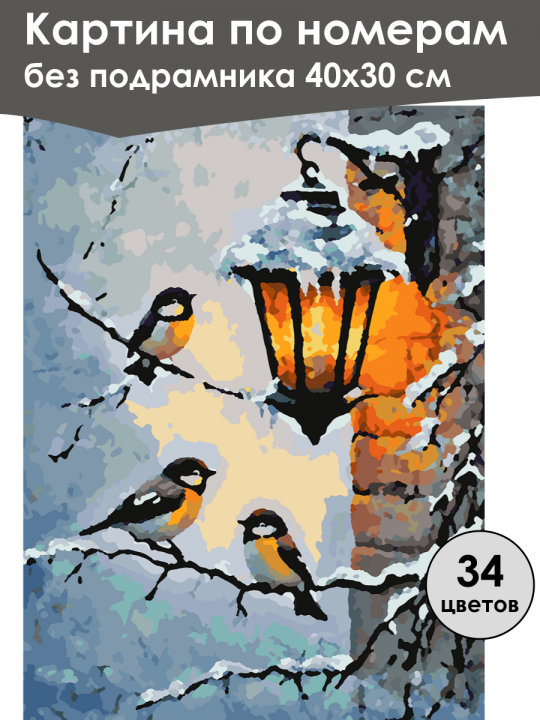 Картина по номерам без подрамника, размер 40х30 см, произведена нами. Она включает 34 оттенков и 1630 контуров, что придаёт ей глубину цвета и плавные переходы. Картина выглядит более ярко и живо. В комплект входит глянцевый лак, которым можно покрыть работу по желанию. Краски имеют хорошую укрывистость, хватает двух проходов что бы закрасить символы на схеме. Так же они сохраняют текстуру мазков, не растекаясь и не разглаживаясь полностью на холсте. При покрытии глянцевым лаком создаётся эффект приближенный к масляной живописи. Краски упакованы герметично, что сохраняет их жидкими. Все необходимые инструменты для начала работы также входят в комплект. Мы не используем экосольвентные чернила, которые содержат свинец и могут быть вредны для здоровья. Наши картины напечатаны безопасными водными пигментными чернилами, обеспечивающими чёткое изображение и легко читаемые обозначения. Холст плотный, имеет мелкую зернистость, легко разглаживается и устойчив к сминанию. Картина поставляется в бурой коробке. Следует отметить, что картина без подрамника её нельзя натянуть на подрамник из-за узких краёв, она предназначена для оформления в рамочку. Три птицы на заснеженных ветках рядом с фонарём, излучающим тёплый свет, окружающий фон выполнен в холодных голубоватых тонах, создавая контраст и атмосферу зимнего вечера.