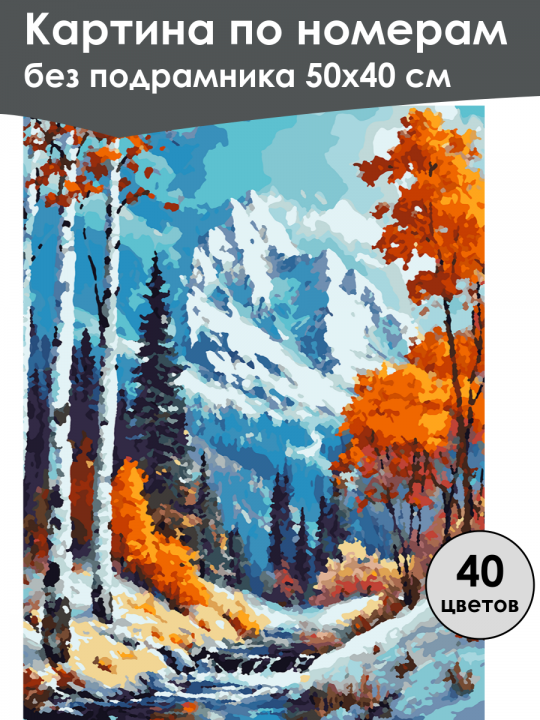 Картина по номерам без подрамника, размер 50х40 см, произведена нами. Она включает 40 оттенков и 3377 контуров, что придаёт ей глубину цвета и плавные переходы. Картина выглядит более ярко и живо. В комплект входит глянцевый лак, которым можно покрыть работу по желанию. Краски имеют хорошую укрывистость, хватает двух проходов что бы закрасить символы на схеме. Так же они сохраняют текстуру мазков, не растекаясь и не разглаживаясь полностью на холсте. При покрытии глянцевым лаком создаётся эффект приближенный к масляной живописи. Краски упакованы герметично, что сохраняет их жидкими. Все необходимые инструменты для начала работы также входят в комплект. Мы не используем экосольвентные чернила, которые содержат свинец и могут быть вредны для здоровья. Наши картины напечатаны безопасными водными пигментными чернилами, обеспечивающими чёткое изображение и легко читаемые обозначения. Холст плотный, имеет мелкую зернистость, легко разглаживается и устойчив к сминанию. Картина поставляется в бурой коробке. Следует отметить, что картина без подрамника её нельзя натянуть на подрамник из-за узких краёв, она предназначена для оформления в рамочку. Осенне-зимний пейзаж с заснеженными горами на заднем плане, рядом с которых вьётся река, окружённая деревьями с яркими оранжевыми листьями и белыми стволами, создающими яркий контраст с голубым небом.