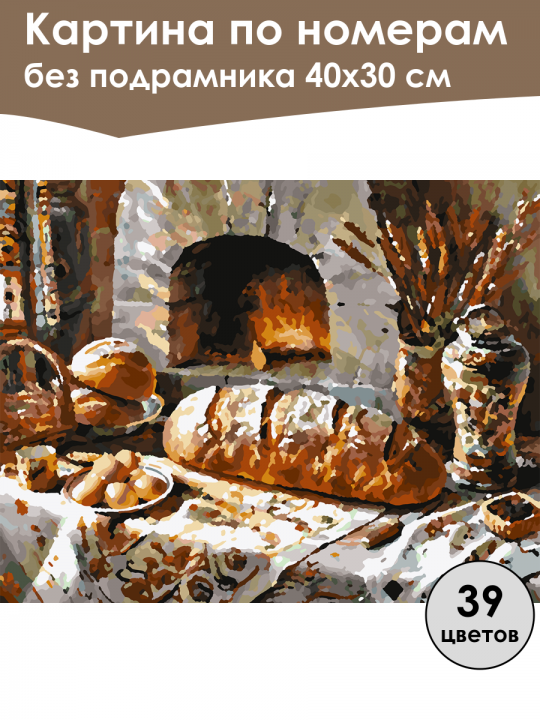 Картина по номерам без подрамника, размер 40х30 см, произведена нами. Она включает 39 оттенков и 3470 контуров, что придаёт ей глубину цвета и плавные переходы. Картина выглядит более ярко и живо. В комплект входит глянцевый лак, которым можно покрыть работу по желанию. Краски имеют хорошую укрывистость, хватает двух проходов что бы закрасить символы на схеме. Так же они сохраняют текстуру мазков, не растекаясь и не разглаживаясь полностью на холсте. При покрытии глянцевым лаком создаётся эффект приближенный к масляной живописи. Краски упакованы герметично, что сохраняет их жидкими. Все необходимые инструменты для начала работы также входят в комплект. Мы не используем экосольвентные чернила, которые содержат свинец и могут быть вредны для здоровья. Наши картины напечатаны безопасными водными пигментными чернилами, обеспечивающими чёткое изображение и легко читаемые обозначения. Холст плотный, имеет мелкую зернистость, легко разглаживается и устойчив к сминанию. Картина поставляется в бурой коробке. Следует отметить, что картина без подрамника её нельзя натянуть на подрамник из-за узких краёв, она предназначена для оформления в рамочку. Живописное натюрмортное представление: на переднем плане расположена разрезанная буханка хлеба, рядом лежат круглые хлеба на тарелке, миска с яйцами и хлебная корзина; сзади видна печь с ярким огнём, а по бокам стоят пучок колосьев и расписные сосуды, общая сцена создает уютную и деревенскую атмосферу благодаря теплым, насыщенным оттенкам и текстурам.