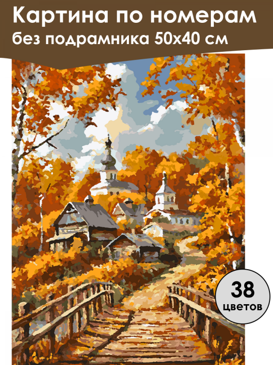 Картина по номерам без подрамника, размер 50х40 см, произведена нами. Она включает 38 оттенков и 4311 контуров, что придаёт ей глубину цвета и плавные переходы. Картина выглядит более ярко и живо. В комплект входит глянцевый лак, которым можно покрыть работу по желанию. Краски имеют хорошую укрывистость, хватает двух проходов что бы закрасить символы на схеме. Так же они сохраняют текстуру мазков, не растекаясь и не разглаживаясь полностью на холсте. При покрытии глянцевым лаком создаётся эффект приближенный к масляной живописи. Краски упакованы герметично, что сохраняет их жидкими. Все необходимые инструменты для начала работы также входят в комплект. Мы не используем экосольвентные чернила, которые содержат свинец и могут быть вредны для здоровья. Наши картины напечатаны безопасными водными пигментными чернилами, обеспечивающими чёткое изображение и легко читаемые обозначения. Холст плотный, имеет мелкую зернистость, легко разглаживается и устойчив к сминанию. Картина поставляется в бурой коробке. Следует отметить, что картина без подрамника её нельзя натянуть на подрамник из-за узких краёв, она предназначена для оформления в рамочку. Яркий осенний пейзаж, выполненный в живописной художественной манере: на переднем плане деревянный мостик ведет в деревню, окружённую деревьями с золотистой листвой, на фоне видны купола церквей под голубым небом с белыми облаками.