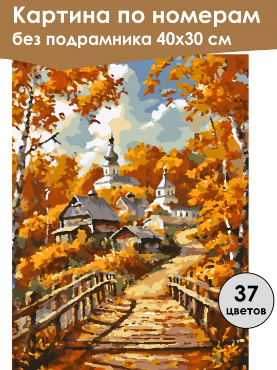 Картина по номерам без подрамника, размер 40х30 см, произведена нами. Она включает 37 оттенков и 3713 контуров, что придаёт ей глубину цвета и плавные переходы. Картина выглядит более ярко и живо. В комплект входит глянцевый лак, которым можно покрыть работу по желанию. Краски имеют хорошую укрывистость, хватает двух проходов что бы закрасить символы на схеме. Так же они сохраняют текстуру мазков, не растекаясь и не разглаживаясь полностью на холсте. При покрытии глянцевым лаком создаётся эффект приближенный к масляной живописи. Краски упакованы герметично, что сохраняет их жидкими. Все необходимые инструменты для начала работы также входят в комплект. Мы не используем экосольвентные чернила, которые содержат свинец и могут быть вредны для здоровья. Наши картины напечатаны безопасными водными пигментными чернилами, обеспечивающими чёткое изображение и легко читаемые обозначения. Холст плотный, имеет мелкую зернистость, легко разглаживается и устойчив к сминанию. Картина поставляется в бурой коробке. Следует отметить, что картина без подрамника её нельзя натянуть на подрамник из-за узких краёв, она предназначена для оформления в рамочку. Яркий осенний пейзаж, выполненный в живописной художественной манере: на переднем плане деревянный мостик ведет в деревню, окружённую деревьями с золотистой листвой, на фоне видны купола церквей под голубым небом с белыми облаками.