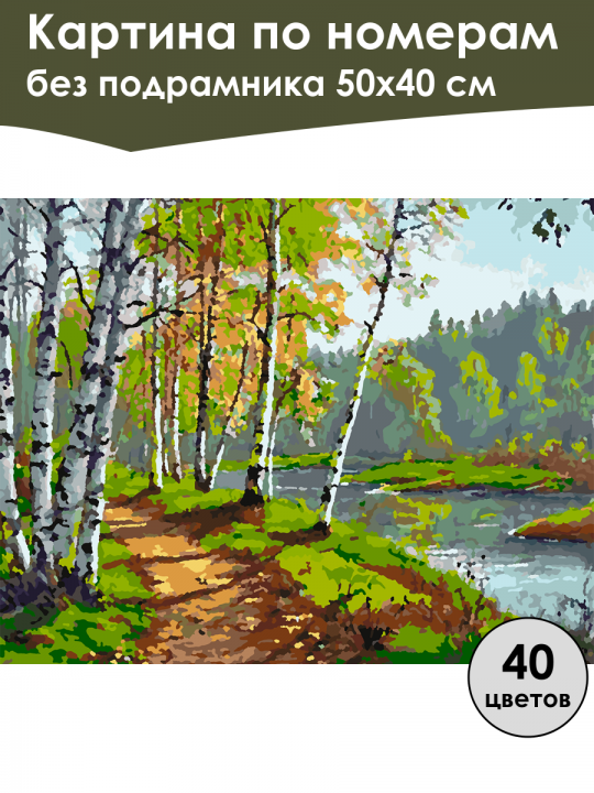 Картина по номерам без подрамника, размер 50х40 см, произведена нами. Она включает 40 оттенков и 3802 контуров, что придаёт ей глубину цвета и плавные переходы. Картина выглядит более ярко и живо. В комплект входит глянцевый лак, которым можно покрыть работу по желанию. Краски имеют хорошую укрывистость, хватает двух проходов что бы закрасить символы на схеме. Так же они сохраняют текстуру мазков, не растекаясь и не разглаживаясь полностью на холсте. При покрытии глянцевым лаком создаётся эффект приближенный к масляной живописи. Краски упакованы герметично, что сохраняет их жидкими. Все необходимые инструменты для начала работы также входят в комплект. Мы не используем экосольвентные чернила, которые содержат свинец и могут быть вредны для здоровья. Наши картины напечатаны безопасными водными пигментными чернилами, обеспечивающими чёткое изображение и легко читаемые обозначения. Холст плотный, имеет мелкую зернистость, легко разглаживается и устойчив к сминанию. Картина поставляется в бурой коробке. Следует отметить, что картина без подрамника её нельзя натянуть на подрамник из-за узких краёв, она предназначена для оформления в рамочку. Пейзажная сцена с берёзовой рощей, где белые стволы деревьев с чёрными пятнами гофрированы тенями от листвы. Дорожка извивается между деревьями, ведущая к спокойной реке, отражающей в себе части зелёной листвы и лазурное небо. На заднем плане виднеется лесная полоса в сумеречном свете, придавая картине атмосферу умиротворения и летней свежести.