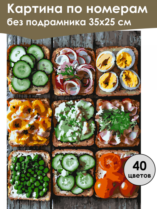 Картина по номерам без подрамника, размер 35х25 см, произведена нами. Она включает 40 оттенков и 2977 контуров, что придаёт ей глубину цвета и плавные переходы. Картина выглядит более ярко и живо. В комплект входит глянцевый лак, которым можно покрыть работу по желанию. Краски качественные, имеют хорошую укрывистость, хватает двух проходов что бы закрасить символы на схеме. Они упакованы герметично, что сохраняет их жидкими. Все необходимые инструменты для начала работы также включены в комплект. Мы не используем экосольвентные чернила, которые содержат свинец и могут быть вредны для здоровья. Наши картины напечатаны безопасными водными пигментными чернилами, обеспечивающими чёткое изображение и легко читаемые обозначения. Холст плотный, имеет мелкую зернистость, легко разглаживается и устойчив к сминанию. Картина поставляется в защищённой бурой коробке. Следует отметить, что картина без подрамника её нельзя натянуть на подрамник из-за узких краёв, она предназначена для оформления в рамочку. Девять квадратных бутербродов на деревянной поверхности, каждый покрыт различными ингредиентами: огурцы, лук, варёные яйца, паста из сырных продуктов или овощей, зелень и кусочки помидоров, представляя разнообразие цветов и текстур.