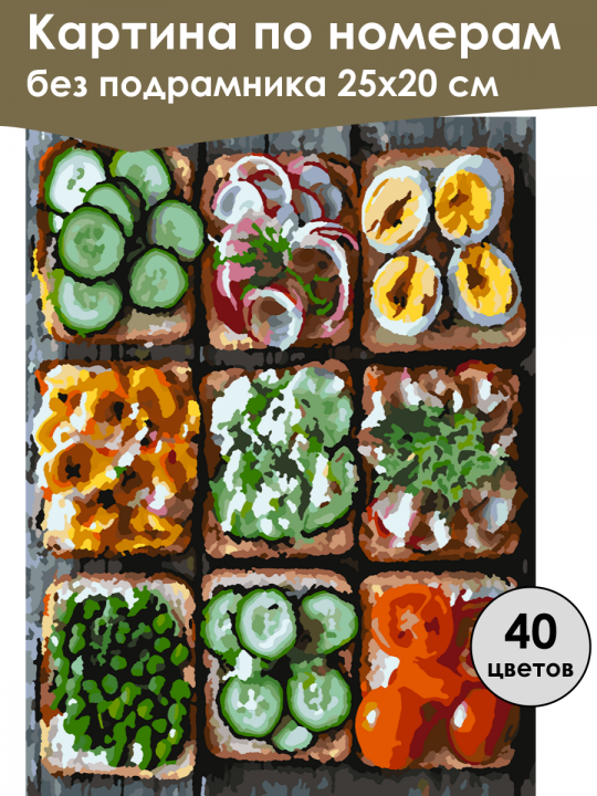 Картина по номерам без подрамника, размер 25х20 см, произведена нами. Она включает 40 оттенков и 1761 контуров, что придаёт ей глубину цвета и плавные переходы. Картина выглядит более ярко и живо. В комплект входит глянцевый лак, которым можно покрыть работу по желанию. Краски качественные, имеют хорошую укрывистость, хватает двух проходов что бы закрасить символы на схеме. Они упакованы герметично, что сохраняет их жидкими. Все необходимые инструменты для начала работы также включены в комплект. Мы не используем экосольвентные чернила, которые содержат свинец и могут быть вредны для здоровья. Наши картины напечатаны безопасными водными пигментными чернилами, обеспечивающими чёткое изображение и легко читаемые обозначения. Холст плотный, имеет мелкую зернистость, легко разглаживается и устойчив к сминанию. Картина поставляется в бурой коробке. Следует отметить, что картина без подрамника её нельзя натянуть на подрамник из-за узких краёв, она предназначена для оформления в рамочку. Девять квадратных бутербродов на деревянной поверхности, каждый покрыт различными ингредиентами: огурцы, лук, варёные яйца, паста из сырных продуктов или овощей, зелень и кусочки помидоров, представляя разнообразие цветов и текстур.