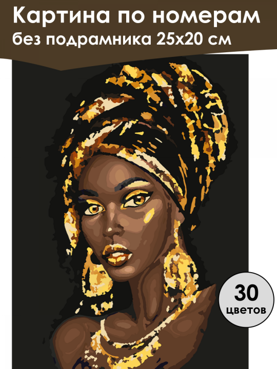 Картина по номерам без подрамника, размер 25х20 см, произведена нами. Она включает 30 оттенков и 606 контуров, что придаёт ей глубину цвета и плавные переходы. Картина выглядит более ярко и живо. В комплект входит глянцевый лак, которым можно покрыть работу по желанию. Краски качественные, имеют хорошую укрывистость, хватает двух проходов что бы закрасить символы на схеме. Они упакованы герметично, что сохраняет их жидкими. Все необходимые инструменты для начала работы также включены в комплект. Мы не используем экосольвентные чернила, которые содержат свинец и могут быть вредны для здоровья. Наши картины напечатаны безопасными водными пигментными чернилами, обеспечивающими чёткое изображение и легко читаемые обозначения. Холст плотный, имеет мелкую зернистость, легко разглаживается и устойчив к сминанию. Картина поставляется в бурой коробке. Следует отметить, что картина без подрамника её нельзя натянуть на подрамник из-за узких краёв, она предназначена для оформления в рамочку. Портрет женщины в этническом стиле, выполненный в ярких теплых тонах. Она носит большой головной убор с абстрактными узорами в жёлто-коричневой гамме. На её лице переливающийся макияж, акцентированный на глаза и губы, добавляющий образу драматичности. Уши украшают крупные круглые серьги, которые гармонируют с ожерельем. Фон тёмный, что подчёркивает насыщенные и контрастные цвета в одежде и аксессуарах женщины, придавая портрету загадочности и выразительности.