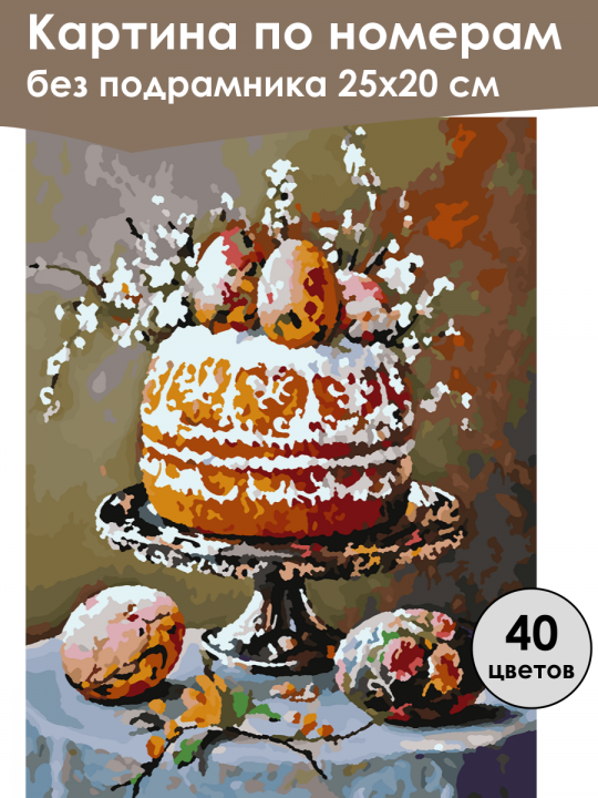 Картина по номерам без подрамника, размер 25х20 см, произведена нами. Она включает 40 оттенков и 1232 контуров, что придаёт ей глубину цвета и плавные переходы. Картина выглядит более ярко и живо. В комплект входит глянцевый лак, которым можно покрыть работу по желанию. Краски качественные, имеют хорошую укрывистость, хватает двух проходов что бы закрасить символы на схеме. Они упакованы герметично, что сохраняет их жидкими. Все необходимые инструменты для начала работы также включены в комплект. Мы не используем экосольвентные чернила, которые содержат свинец и могут быть вредны для здоровья. Наши картины напечатаны безопасными водными пигментными чернилами, обеспечивающими чёткое изображение и легко читаемые обозначения. Холст плотный, имеет мелкую зернистость, легко разглаживается и устойчив к сминанию. Картина поставляется в бурой коробке. Следует отметить, что картина без подрамника её нельзя натянуть на подрамник из-за узких краёв, она предназначена для оформления в рамочку. Пасхальный натюрморт с куличом, украшенным белой глазурью и цветочным узором, находящимся на изысканной подставке; сверху лежат три расписных яйца, окружённые белыми цветами, а на переднем плане на светлой скатерти лежат ещё два красочно украшенных яйца и разбросаны лепестки цветов.