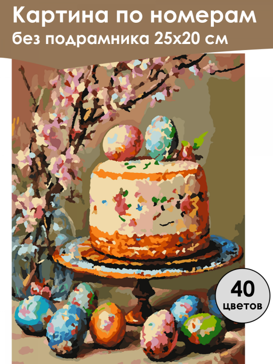 Картина по номерам без подрамника, размер 25х20 см, произведена нами. Она включает 40 оттенков и 1482 контуров, что придаёт ей глубину цвета и плавные переходы. Картина выглядит более ярко и живо. В комплект входит глянцевый лак, которым можно покрыть работу по желанию. Краски качественные, имеют хорошую укрывистость, хватает двух проходов что бы закрасить символы на схеме. Они упакованы герметично, что сохраняет их жидкими. Все необходимые инструменты для начала работы также включены в комплект. Мы не используем экосольвентные чернила, которые содержат свинец и могут быть вредны для здоровья. Наши картины напечатаны безопасными водными пигментными чернилами, обеспечивающими чёткое изображение и легко читаемые обозначения. Холст плотный, имеет мелкую зернистость, легко разглаживается и устойчив к сминанию. Картина поставляется в бурой коробке. Следует отметить, что картина без подрамника её нельзя натянуть на подрамник из-за узких краёв, она предназначена для оформления в рамочку. Красочно оформленная картина в стиле постимпрессионизма, изображающая праздничную сцену с украшенным пасхальным куличом на высоком блюде и несколькими расписными яйцами на столе, на заднем фоне цветущая ветвь дерева, создающая весеннее, жизнерадостное настроение.