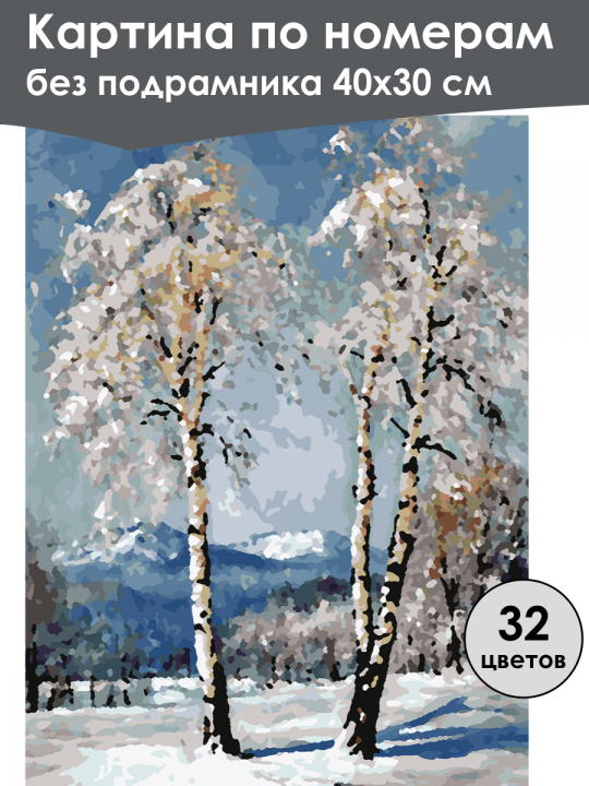 Картина по номерам без подрамника, размер 40х30 см, произведена нами. Она включает 32 оттенков и 3256 контуров, что придаёт ей глубину цвета и плавные переходы. Картина выглядит более ярко и живо. В комплект входит глянцевый лак, которым можно покрыть работу по желанию. Краски имеют хорошую укрывистость, хватает двух проходов что бы закрасить символы на схеме. Так же они сохраняют текстуру мазков, не растекаясь и не разглаживаясь полностью на холсте. При покрытии глянцевым лаком создаётся эффект приближенный к масляной живописи. Краски упакованы герметично, что сохраняет их жидкими. Все необходимые инструменты для начала работы также входят в комплект. Мы не используем экосольвентные чернила, которые содержат свинец и могут быть вредны для здоровья. Наши картины напечатаны безопасными водными пигментными чернилами, обеспечивающими чёткое изображение и легко читаемые обозначения. Холст плотный, имеет мелкую зернистость, легко разглаживается и устойчив к сминанию. Картина поставляется в бурой коробке. Следует отметить, что картина без подрамника её нельзя натянуть на подрамник из-за узких краёв, она предназначена для оформления в рамочку. Два покрытые снегом дерева на фоне зимнего пейзажа, с заснеженными горами вдали и ясным голубым небом, создающим атмосферу спокойствия и зимней свежести.