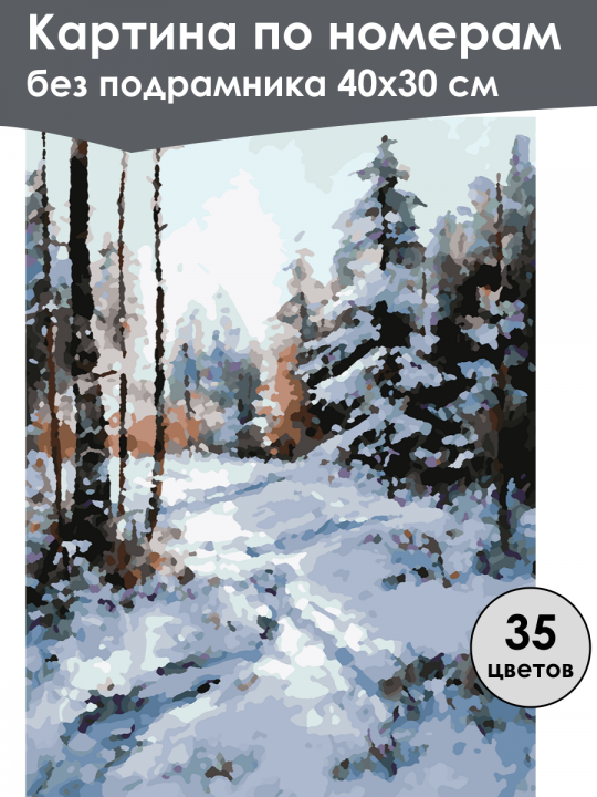 Картина по номерам без подрамника, размер 40х30 см, произведена нами. Она включает 35 оттенков и 2415 контуров, что придаёт ей глубину цвета и плавные переходы. Картина выглядит более ярко и живо. В комплект входит глянцевый лак, которым можно покрыть работу по желанию. Краски имеют хорошую укрывистость, хватает двух проходов что бы закрасить символы на схеме. Так же они сохраняют текстуру мазков, не растекаясь и не разглаживаясь полностью на холсте. При покрытии глянцевым лаком создаётся эффект приближенный к масляной живописи. Краски упакованы герметично, что сохраняет их жидкими. Все необходимые инструменты для начала работы также входят в комплект. Мы не используем экосольвентные чернила, которые содержат свинец и могут быть вредны для здоровья. Наши картины напечатаны безопасными водными пигментными чернилами, обеспечивающими чёткое изображение и легко читаемые обозначения. Холст плотный, имеет мелкую зернистость, легко разглаживается и устойчив к сминанию. Картина поставляется в бурой коробке. Следует отметить, что картина без подрамника её нельзя натянуть на подрамник из-за узких краёв, она предназначена для оформления в рамочку. Заснеженный зимний пейзаж с высокими деревьями, покрытыми снегом, светлая солнечная тропа ведет через лес, создавая настроение спокойствия и уединения в природе.