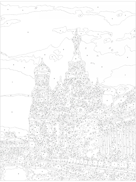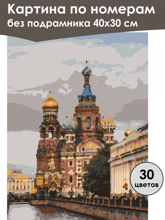 Картина по номерам без подрамника, размер 40х30 см, произведена нами. Она включает 30 оттенков и 1718 контуров, что придаёт ей глубину цвета и плавные переходы. Картина выглядит более ярко и живо. В комплект входит глянцевый лак, которым можно покрыть работу по желанию. Краски имеют хорошую укрывистость, хватает двух проходов что бы закрасить символы на схеме. Так же они сохраняют текстуру мазков, не растекаясь и не разглаживаясь полностью на холсте. При покрытии глянцевым лаком создаётся эффект приближенный к масляной живописи. Краски упакованы герметично, что сохраняет их жидкими. Все необходимые инструменты для начала работы также входят в комплект. Мы не используем экосольвентные чернила, которые содержат свинец и могут быть вредны для здоровья. Наши картины напечатаны безопасными водными пигментными чернилами, обеспечивающими чёткое изображение и легко читаемые обозначения. Холст плотный, имеет мелкую зернистость, легко разглаживается и устойчив к сминанию. Картина поставляется в бурой коробке. Следует отметить, что картина без подрамника её нельзя натянуть на подрамник из-за узких краёв, она предназначена для оформления в рамочку. Собор Спас на Крови, с разноцветными куполами в традиционном русском стиле, расположенный рядом с каналом и старинными зданиями, придающий месту атмосферу исторической значимости и архитектурного великолепия, под светло-серым небом.