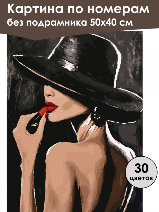 Картина по номерам без подрамника, размер 50х40 см, произведена нами. Она включает 30 оттенков и 1220 контуров, что придаёт ей глубину цвета и плавные переходы. Картина выглядит более ярко и живо. В комплект входит глянцевый лак, которым можно покрыть работу по желанию. Краски имеют хорошую укрывистость, хватает двух проходов что бы закрасить символы на схеме. Так же они сохраняют текстуру мазков, не растекаясь и не разглаживаясь полностью на холсте. При покрытии глянцевым лаком создаётся эффект приближенный к масляной живописи. Краски упакованы герметично, что сохраняет их жидкими. Все необходимые инструменты для начала работы также входят в комплект. Мы не используем экосольвентные чернила, которые содержат свинец и могут быть вредны для здоровья. Наши картины напечатаны безопасными водными пигментными чернилами, обеспечивающими чёткое изображение и легко читаемые обозначения. Холст плотный, имеет мелкую зернистость, легко разглаживается и устойчив к сминанию. Картина поставляется в бурой коробке. Следует отметить, что картина без подрамника её нельзя натянуть на подрамник из-за узких краёв, она предназначена для оформления в рамочку. Женщина в широкополой шляпе наносит ярко-красную помаду, картина выполнена в стилизованной живописной манере с акцентом на контрасты и тени, фон затемнён, создавая атмосферу интриги и загадочности.
