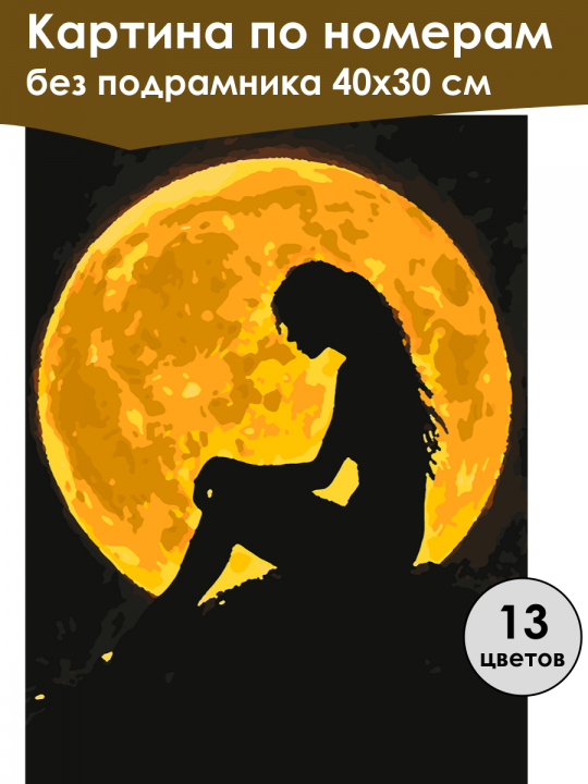 Картина по номерам без подрамника, размер 40х30 см, произведена нами. Она включает 13 оттенков и 396 контуров, что придаёт ей глубину цвета и плавные переходы. Картина выглядит более ярко и живо. В комплект входит глянцевый лак, которым можно покрыть работу по желанию. Краски имеют хорошую укрывистость, хватает двух проходов что бы закрасить символы на схеме. Так же они сохраняют текстуру мазков, не растекаясь и не разглаживаясь полностью на холсте. При покрытии глянцевым лаком создаётся эффект приближенный к масляной живописи. Краски упакованы герметично, что сохраняет их жидкими. Все необходимые инструменты для начала работы также входят в комплект. Мы не используем экосольвентные чернила, которые содержат свинец и могут быть вредны для здоровья. Наши картины напечатаны безопасными водными пигментными чернилами, обеспечивающими чёткое изображение и легко читаемые обозначения. Холст плотный, имеет мелкую зернистость, легко разглаживается и устойчив к сминанию. Картина поставляется в бурой коробке. Следует отметить, что картина без подрамника её нельзя натянуть на подрамник из-за узких краёв, она предназначена для оформления в рамочку. Силуэт девушки сидящей в позе задумчивости с длинными волосами перед яркой большой луной в ночном небе, создающий контраст между тёмными и светлыми элементами картины.