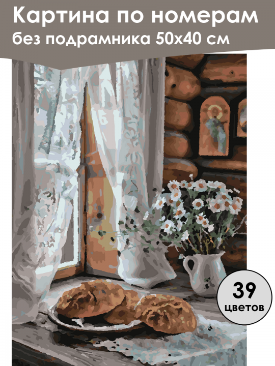 Картина по номерам без подрамника, размер 50х40 см, произведена нами. Она включает 39 оттенков и 3078 контуров, что придаёт ей глубину цвета и плавные переходы. Картина выглядит более ярко и живо. В комплект входит глянцевый лак, которым можно покрыть работу по желанию. Краски имеют хорошую укрывистость, хватает двух проходов что бы закрасить символы на схеме. Так же они сохраняют текстуру мазков, не растекаясь и не разглаживаясь полностью на холсте. При покрытии глянцевым лаком создаётся эффект приближенный к масляной живописи. Краски упакованы герметично, что сохраняет их жидкими. Все необходимые инструменты для начала работы также входят в комплект. Мы не используем экосольвентные чернила, которые содержат свинец и могут быть вредны для здоровья. Наши картины напечатаны безопасными водными пигментными чернилами, обеспечивающими чёткое изображение и легко читаемые обозначения. Холст плотный, имеет мелкую зернистость, легко разглаживается и устойчив к сминанию. Картина поставляется в бурой коробке. Следует отметить, что картина без подрамника её нельзя натянуть на подрамник из-за узких краёв, она предназначена для оформления в рамочку. Деревянное окно с кружевными шторами, на подоконнике стоит кувшин с ромашками и лежат несколько буханок хлеба на тарелке, интерьер выполнен в деревенском стиле с элементами деревянного зодчества и иконой на стене.