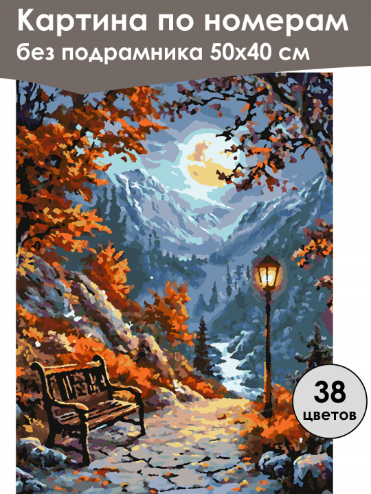Картина по номерам без подрамника, размер 50х40 см, произведена нами. Она включает 38 оттенков и 4082 контуров, что придаёт ей глубину цвета и плавные переходы. Картина выглядит более ярко и живо. В комплект входит глянцевый лак, которым можно покрыть работу по желанию. Краски имеют хорошую укрывистость, хватает двух проходов что бы закрасить символы на схеме. Так же они сохраняют текстуру мазков, не растекаясь и не разглаживаясь полностью на холсте. При покрытии глянцевым лаком создаётся эффект приближенный к масляной живописи. Краски упакованы герметично, что сохраняет их жидкими. Все необходимые инструменты для начала работы также входят в комплект. Мы не используем экосольвентные чернила, которые содержат свинец и могут быть вредны для здоровья. Наши картины напечатаны безопасными водными пигментными чернилами, обеспечивающими чёткое изображение и легко читаемые обозначения. Холст плотный, имеет мелкую зернистость, легко разглаживается и устойчив к сминанию. Картина поставляется в бурой коробке. Следует отметить, что картина без подрамника её нельзя натянуть на подрамник из-за узких краёв, она предназначена для оформления в рамочку. Осенний пейзаж: тропинка в горах освещена загадочным лунным светом и уличным фонарем, окружённая пышной растительностью с яркими оранжевыми и красными листьями; на тропинке стоит деревянная скамейка, а вдали виднеются горы и лес.