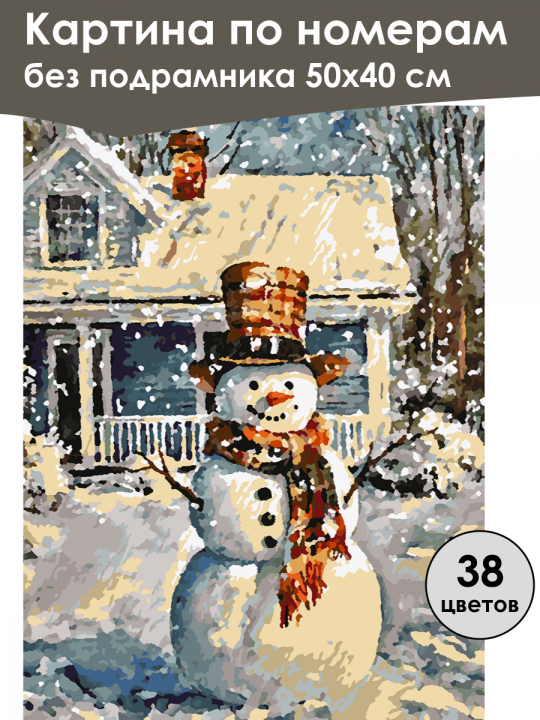 Картина по номерам без подрамника, размер 50х40 см, произведена нами. Она включает 38 оттенков и 3850 контуров, что придаёт ей глубину цвета и плавные переходы. Картина выглядит более ярко и живо. В комплект входит глянцевый лак, которым можно покрыть работу по желанию. Краски имеют хорошую укрывистость, хватает двух проходов что бы закрасить символы на схеме. Так же они сохраняют текстуру мазков, не растекаясь и не разглаживаясь полностью на холсте. При покрытии глянцевым лаком создаётся эффект приближенный к масляной живописи. Краски упакованы герметично, что сохраняет их жидкими. Все необходимые инструменты для начала работы также входят в комплект. Мы не используем экосольвентные чернила, которые содержат свинец и могут быть вредны для здоровья. Наши картины напечатаны безопасными водными пигментными чернилами, обеспечивающими чёткое изображение и легко читаемые обозначения. Холст плотный, имеет мелкую зернистость, легко разглаживается и устойчив к сминанию. Картина поставляется в бурой коробке. Следует отметить, что картина без подрамника её нельзя натянуть на подрамник из-за узких краёв, она предназначена для оформления в рамочку. Иллюстрированный снеговик с морковным носом и пуговицами, украшенный полосатым шарфом и клетчатой шляпой, стоящий перед домом с заснеженной крышей и трубой, окружённым снежным пейзажем и деревьями на заднем плане.