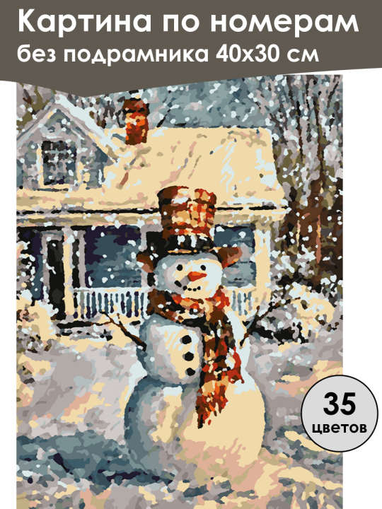 Картина по номерам без подрамника, размер 40х30 см, произведена нами. Она включает 35 оттенков и 3586 контуров, что придаёт ей глубину цвета и плавные переходы. Картина выглядит более ярко и живо. В комплект входит глянцевый лак, которым можно покрыть работу по желанию. Краски имеют хорошую укрывистость, хватает двух проходов что бы закрасить символы на схеме. Так же они сохраняют текстуру мазков, не растекаясь и не разглаживаясь полностью на холсте. При покрытии глянцевым лаком создаётся эффект приближенный к масляной живописи. Краски упакованы герметично, что сохраняет их жидкими. Все необходимые инструменты для начала работы также входят в комплект. Мы не используем экосольвентные чернила, которые содержат свинец и могут быть вредны для здоровья. Наши картины напечатаны безопасными водными пигментными чернилами, обеспечивающими чёткое изображение и легко читаемые обозначения. Холст плотный, имеет мелкую зернистость, легко разглаживается и устойчив к сминанию. Картина поставляется в бурой коробке. Следует отметить, что картина без подрамника её нельзя натянуть на подрамник из-за узких краёв, она предназначена для оформления в рамочку. Иллюстрированный снеговик с морковным носом и пуговицами, украшенный полосатым шарфом и клетчатой шляпой, стоящий перед домом с заснеженной крышей и трубой, окружённым снежным пейзажем и деревьями на заднем плане.