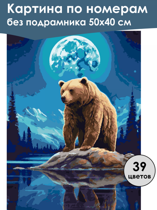 Картина по номерам без подрамника, размер 50х40 см, произведена нами. Она включает 39 оттенков и 1693 контуров, что придаёт ей глубину цвета и плавные переходы. Картина выглядит более ярко и живо. В комплект входит глянцевый лак, которым можно покрыть работу по желанию. Краски имеют хорошую укрывистость, хватает двух проходов что бы закрасить символы на схеме. Так же они сохраняют текстуру мазков, не растекаясь и не разглаживаясь полностью на холсте. При покрытии глянцевым лаком создаётся эффект приближенный к масляной живописи. Краски упакованы герметично, что сохраняет их жидкими. Все необходимые инструменты для начала работы также входят в комплект. Мы не используем экосольвентные чернила, которые содержат свинец и могут быть вредны для здоровья. Наши картины напечатаны безопасными водными пигментными чернилами, обеспечивающими чёткое изображение и легко читаемые обозначения. Холст плотный, имеет мелкую зернистость, легко разглаживается и устойчив к сминанию. Картина поставляется в бурой коробке. Следует отметить, что картина без подрамника её нельзя натянуть на подрамник из-за узких краёв, она предназначена для оформления в рамочку. Большой медведь стоит на скале посреди зеркальной водной глади, вокруг возвышаются ёлки, на заднем плане видны заснеженные горы, а над ними ярко светит полная луна на глубоком синем небе.
