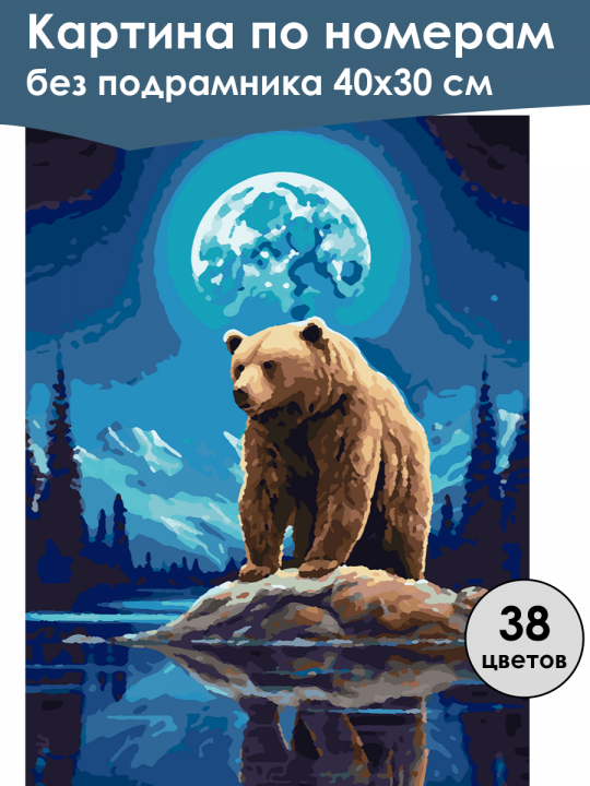 Картина по номерам без подрамника, размер 40х30 см, произведена нами. Она включает 38 оттенков и 1361 контуров, что придаёт ей глубину цвета и плавные переходы. Картина выглядит более ярко и живо. В комплект входит глянцевый лак, которым можно покрыть работу по желанию. Краски имеют хорошую укрывистость, хватает двух проходов что бы закрасить символы на схеме. Так же они сохраняют текстуру мазков, не растекаясь и не разглаживаясь полностью на холсте. При покрытии глянцевым лаком создаётся эффект приближенный к масляной живописи. Краски упакованы герметично, что сохраняет их жидкими. Все необходимые инструменты для начала работы также входят в комплект. Мы не используем экосольвентные чернила, которые содержат свинец и могут быть вредны для здоровья. Наши картины напечатаны безопасными водными пигментными чернилами, обеспечивающими чёткое изображение и легко читаемые обозначения. Холст плотный, имеет мелкую зернистость, легко разглаживается и устойчив к сминанию. Картина поставляется в бурой коробке. Следует отметить, что картина без подрамника её нельзя натянуть на подрамник из-за узких краёв, она предназначена для оформления в рамочку. Большой медведь стоит на скале посреди зеркальной водной глади, вокруг возвышаются ёлки, на заднем плане видны заснеженные горы, а над ними ярко светит полная луна на глубоком синем небе.