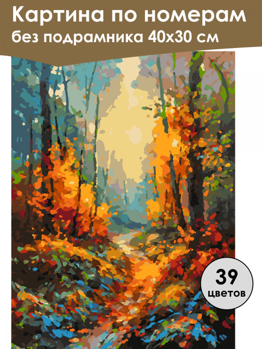 Картина по номерам без подрамника, размер 40х30 см, произведена нами. Она включает 39 оттенков и 3035 контуров, что придаёт ей глубину цвета и плавные переходы. Картина выглядит более ярко и живо. В комплект входит глянцевый лак, которым можно покрыть работу по желанию. Краски имеют хорошую укрывистость, хватает двух проходов что бы закрасить символы на схеме. Так же они сохраняют текстуру мазков, не растекаясь и не разглаживаясь полностью на холсте. При покрытии глянцевым лаком создаётся эффект приближенный к масляной живописи. Краски упакованы герметично, что сохраняет их жидкими. Все необходимые инструменты для начала работы также входят в комплект. Мы не используем экосольвентные чернила, которые содержат свинец и могут быть вредны для здоровья. Наши картины напечатаны безопасными водными пигментными чернилами, обеспечивающими чёткое изображение и легко читаемые обозначения. Холст плотный, имеет мелкую зернистость, легко разглаживается и устойчив к сминанию. Картина поставляется в бурой коробке. Следует отметить, что картина без подрамника её нельзя натянуть на подрамник из-за узких краёв, она предназначена для оформления в рамочку. Осенняя лесная сцена в стиле импрессионизма, где деревья с тёмными стволами и яркими красно-оранжевыми листьями окружают извилистую тропинку, ведущую вглубь леса, под тёплым жёлтым светом, который мягко проникает сквозь густую листву, создавая атмосферу уюта и умиротворения.