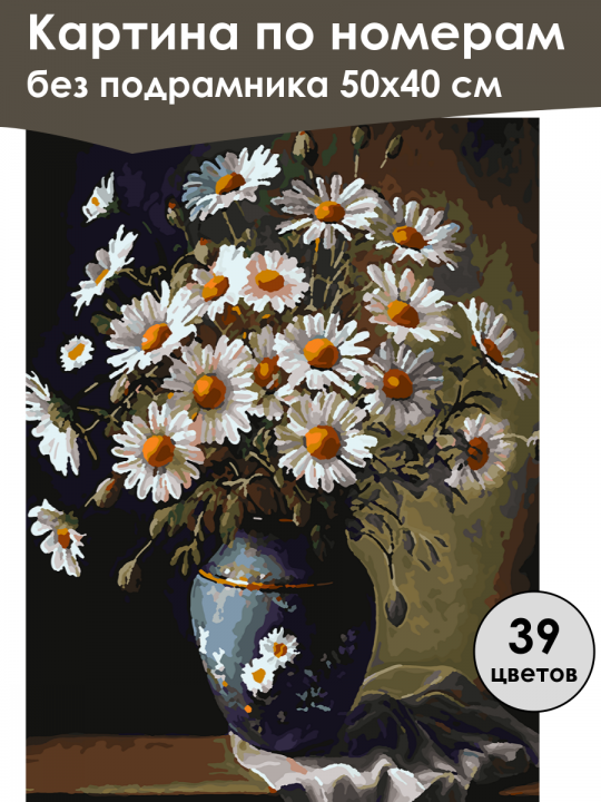 Картина по номерам без подрамника, размер 50х40 см, произведена нами. Она включает 39 оттенков и 2673 контуров, что придаёт ей глубину цвета и плавные переходы. Картина выглядит более ярко и живо. В комплект входит глянцевый лак, которым можно покрыть работу по желанию. Краски имеют хорошую укрывистость, хватает двух проходов что бы закрасить символы на схеме. Так же они сохраняют текстуру мазков, не растекаясь и не разглаживаясь полностью на холсте. При покрытии глянцевым лаком создаётся эффект приближенный к масляной живописи. Краски упакованы герметично, что сохраняет их жидкими. Все необходимые инструменты для начала работы также входят в комплект. Мы не используем экосольвентные чернила, которые содержат свинец и могут быть вредны для здоровья. Наши картины напечатаны безопасными водными пигментными чернилами, обеспечивающими чёткое изображение и легко читаемые обозначения. Холст плотный, имеет мелкую зернистость, легко разглаживается и устойчив к сминанию. Картина поставляется в бурой коробке. Следует отметить, что картина без подрамника её нельзя натянуть на подрамник из-за узких краёв, она предназначена для оформления в рамочку. Крупный букет ромашек с белыми лепестками и ярко-оранжевыми сердцевинами, стоящий в синей вазе с золотистыми элементами, на фоне тёмно-коричневых и зелёных оттенков, создающих гармоничную композицию, рядом виден аккуратно сложенный светлый платок.
